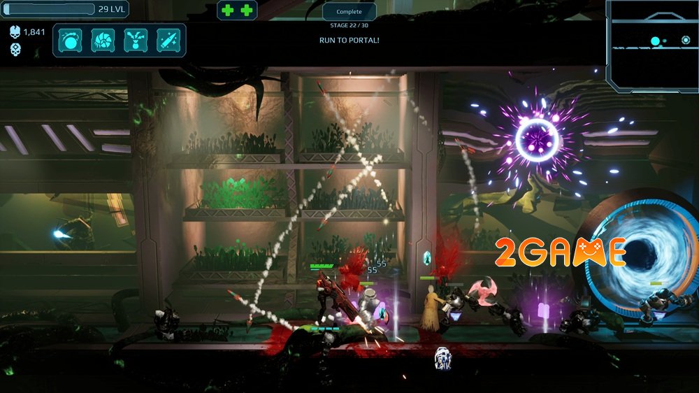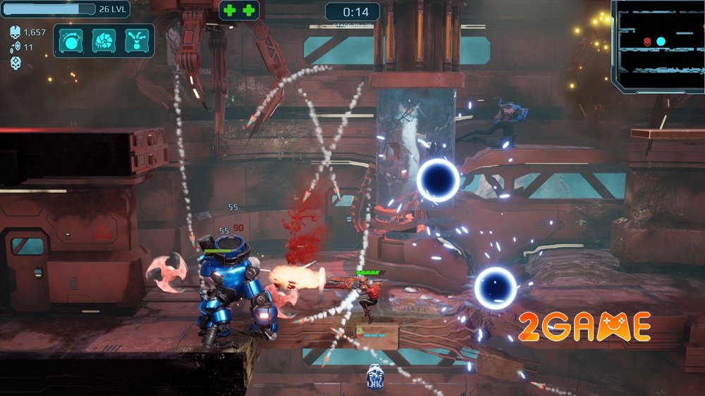 Bạn sẽ cảm nhận ngay sự điên cuồng của lối chơi platformer hành động tốc độ cao xen lẫn roguelike sâu sắc. Mỗi lần chạy là một hành trình hoàn toàn mới, nơi bạn liên tục chuyển vũ khí một cách mượt mà giữa kiếm cận chiến sắc lẹm, súng trường tự động dồn dập, pháo hạng nặng nổ tung trời đất, tia năng lượng nguyên tố và cả tháp pháo tự động yểm trợ từ trên không.