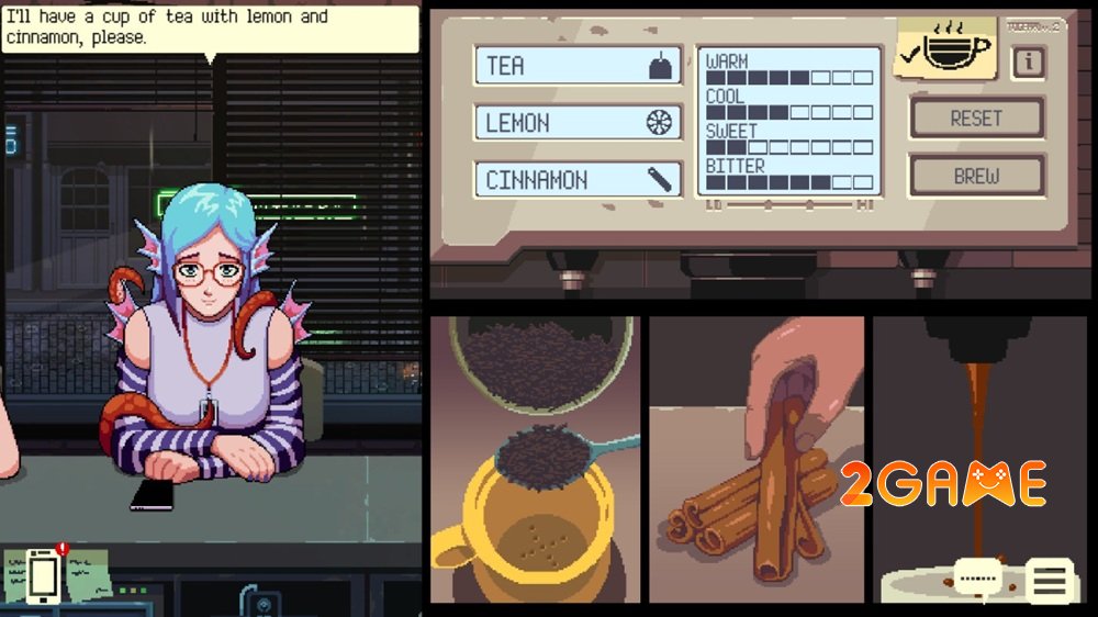 Ra mắt lần đầu năm 2020 trên PC, PS4/5, Xbox, Switch, Coffee Talk nhanh chóng chinh phục hàng triệu game thủ nhờ lối chơi độc đáo: kết hợp visual novel với mô phỏng pha chế. Không chỉ nghe chuyện, lựa chọn đồ uống của bạn sẽ dẫn dắt những nhánh cốt truyện bất ngờ, tạo nên hàng tá kết thúc đa dạng. Bối cảnh là Seattle song song kỳ ảo, nơi con người chung sống hòa hợp với elf thanh lịch, orc lực lưỡng, succubus quyến rũ hay các sinh vật huyền bí khác. Đồ họa pixel art gợi nhớ anime thập niên 90, với tông màu ấm áp, mưa đêm lất phất, khiến mỗi buổi chơi như một buổi cà phê thực thụ.