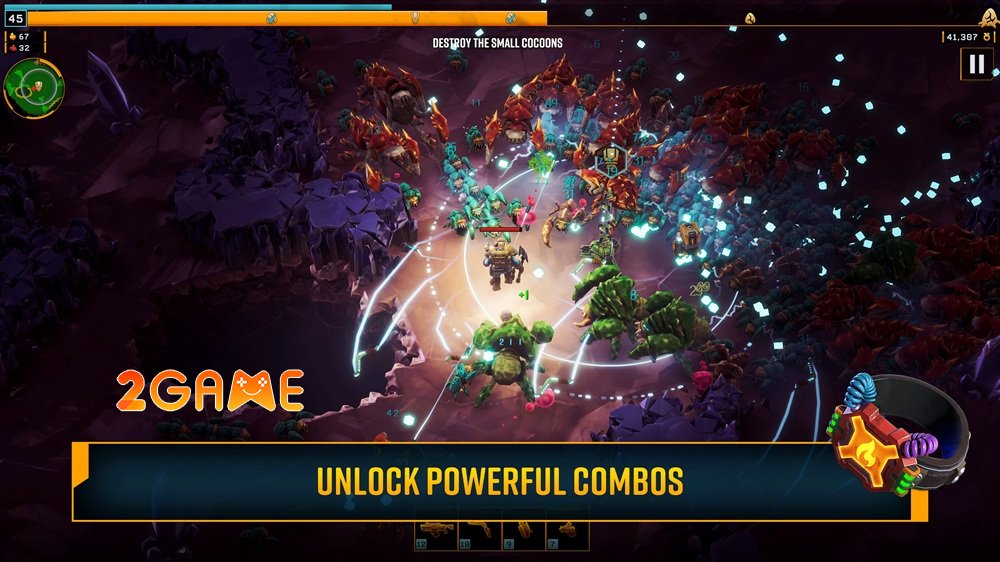 Với yếu tố roguelike, hang động trong game Deep Rock Galactic: Survivor không bao giờ lặp lại. Mỗi lần Drop Pod mở cửa, bạn bước vào một thế giới mới: lúc thì mê cung hẹp đến nghẹt thở, lúc thì đấu trường rộng lớn với những cột đá khổng lồ làm lá chắn tạm thời. Địch cũng vậy – không có kịch bản.