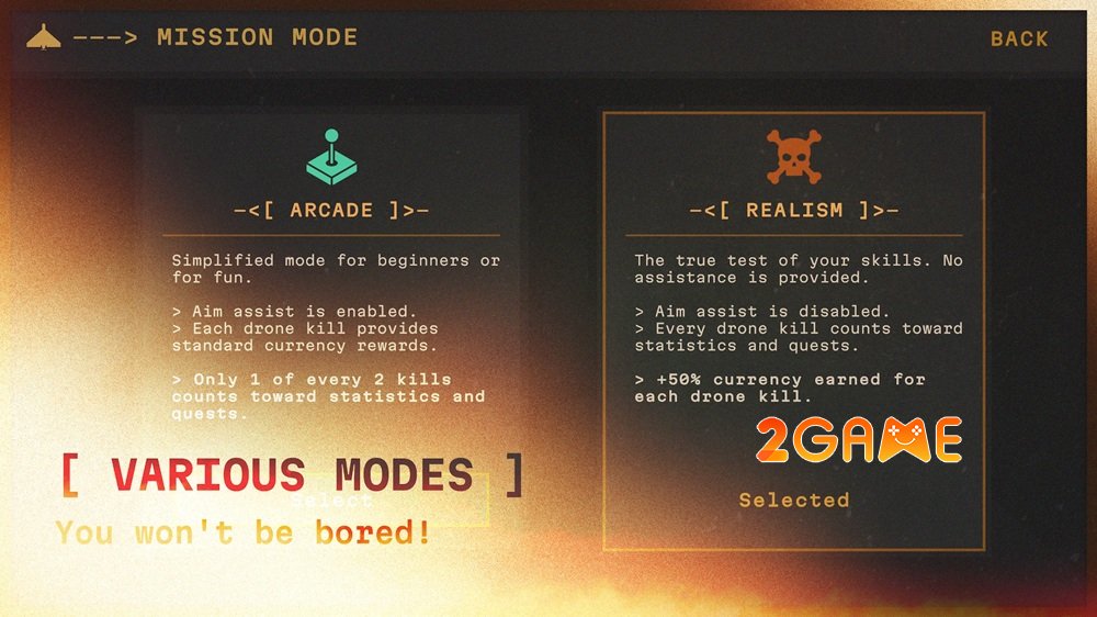 Game Drone Hunter Mobile không dừng ở những pha bắn súng arcade đơn thuần. Drone Hunter mang đến hai chế độ chơi cuốn hút, nối liền nhau như một hành trình chinh phục. Arcade Mode dành cho những ai thích nhảy vào trận đánh nhanh, rèn luyện tay nghề với hỗ trợ ngắm dự đoán thông minh. Nhưng khi bạn sẵn sàng, chuyển sang Realism Mode: mọi thứ trở nên khắc nghiệt thực sự. Không aim assist, đạn hết là hết, drone mỗi con đều “đắt giá” bằng tiền tệ kiếm được. Vũ khí quá nhiệt đỏ rực, buộc bạn nạp đạn chiến thuật giữa cơn mưa kẻ thù – chiến lược giờ đây quyết định tất cả, biến bạn từ tay súng thành chỉ huy tài ba.