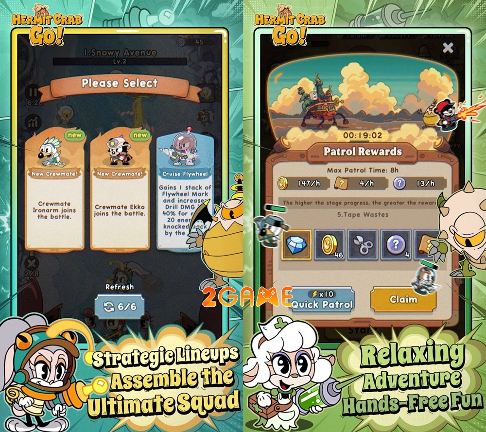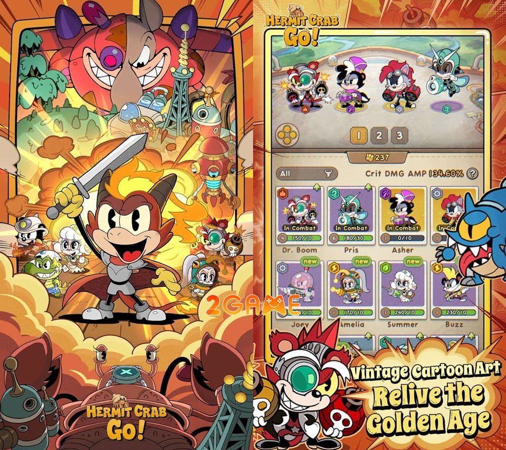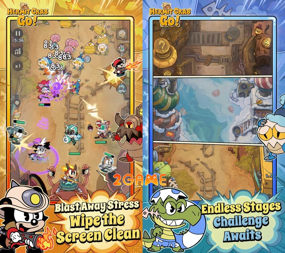 Ngay từ những giây phút đầu tiên, HERMIT CRAB GO cuốn hút bạn bằng lối chơi roguelike theo chiều dọc độc đáo, nơi mỗi màn chơi là một đợt sóng kẻ thù mới mẻ, đầy thách thức và không lặp lại. Bạn không chỉ đơn thuần điều khiển một nhân vật, mà xây dựng cả một đội hình gồm những đồng đội đáng yêu đến lạ: chú sóc lười biếng thích ngủ nướng, con quạ cáu kỉnh nhưng cực kỳ thông minh, chú sói dũng mãnh luôn sẵn sàng lao lên tuyến đầu, hay cậu cá sấu ngây thơ với nụ cười khiến ai cũng phải tan chảy.
