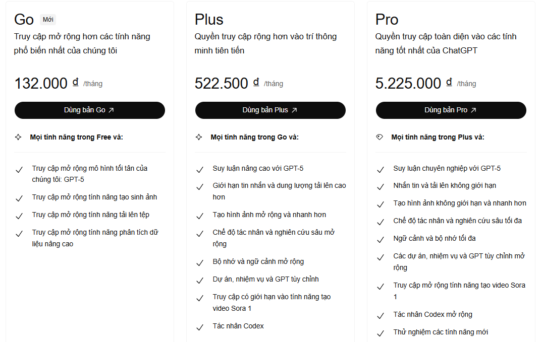 | ChatGPT Pro | GPT-5 Reasoning | Rất cao | 200 USD | Nhà nghiên cứu, tổ chức chuyên sâu |