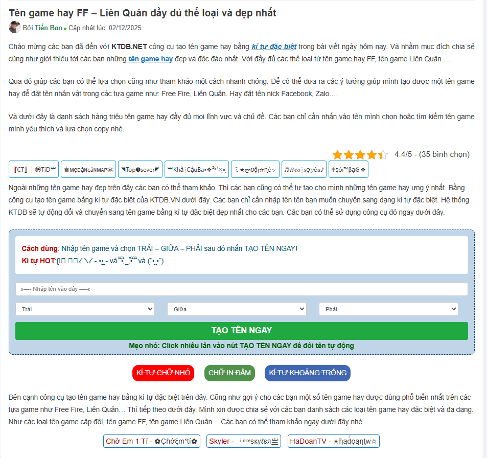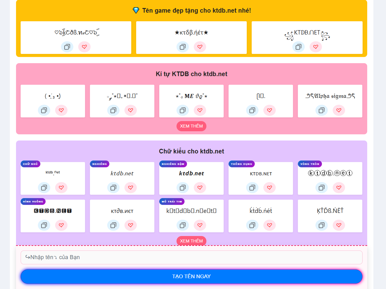 Bạn đang tìm một trang web tạo ký tự đặc biệt, chữ nghệ thuật, font chữ độc lạ để dùng trên Facebook, TikTok, Zalo hay các tựa game như Free Fire, Liên Quân, PUBG, Roblox…? KTDB.net chính là công cụ hoàn hảo dành cho bạn!