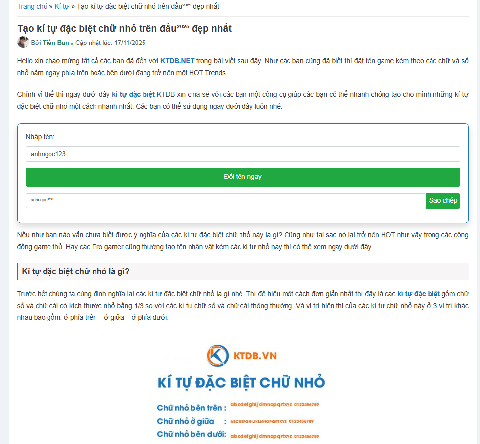 Ở Việt Nam, khi người dùng tìm kiếm từ khóa “KTDB”, họ thường muốn sử dụng một công cụ tạo ký tự đặc biệt online. Và một trong những website nổi bật nhất hiện nay chính là: KTDB.net