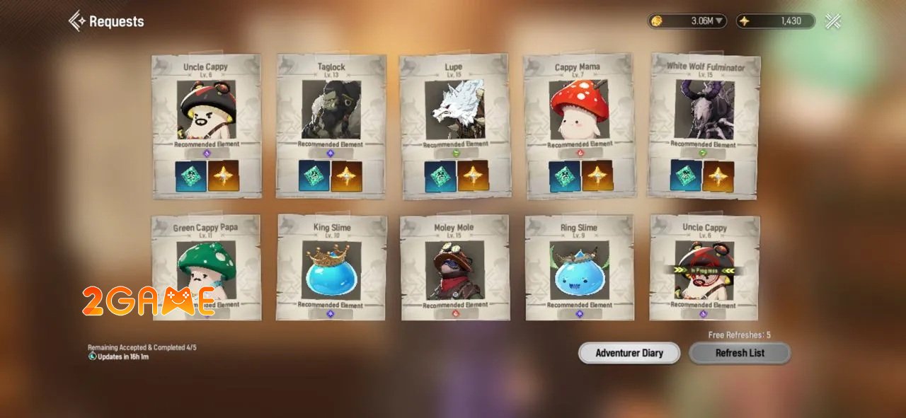 Bên cạnh đó, bạn không nên bỏ lỡ các Yêu cầu hàng ngày (Daily Requests) tại bảng tin ở trung tâm Gathering Hub để tối ưu hóa lượng kinh nghiệm nhận được mỗi ngày. Với tối đa 5 yêu cầu được làm mới liên tục, nhiệm vụ của bạn thường là tiêu diệt những loài quái vật cụ thể đang gây rối trong thế giới game game Mongil: Star Dive, mang về thêm 1.500 điểm EXP một cách nhanh chóng.