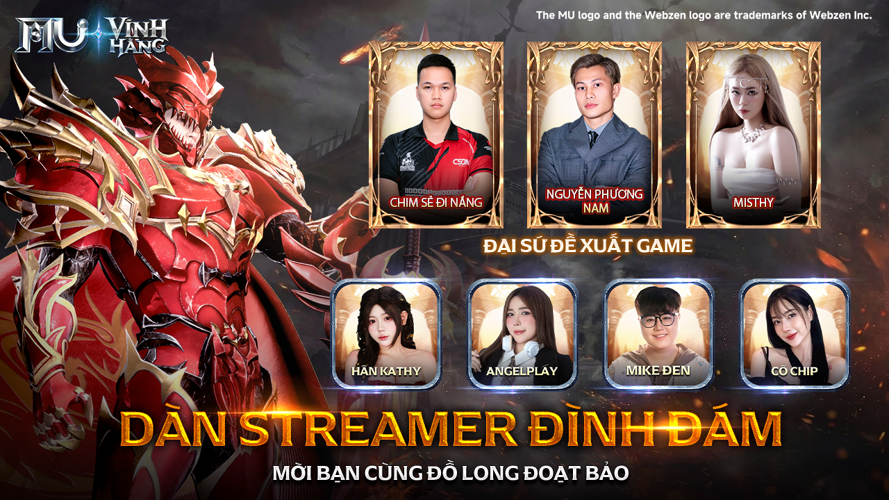 Bên cạnh đó, để thể hiện sức hấp dẫn của《MU: VĨNH HẰNG》một cách toàn diện, BTC chính thức mời gọi dàn streamer đình đám bao gồm Mike Đen, Angelplay, Duy Lê, Review Game Mobile, Ousay Gaming, Minn Ú, và nhiều gương mặt nổi tiếng khác, tạo thành đội ngũ livestream hùng hậu. Thông qua các buổi livestream toàn diện từ nhập môn đến nâng cao, họ sẽ dẫn dắt người chơi khám phá sâu sắc thế giới kỳ ảo rộng lớn vô tận này, tận tay hướng dẫn bạn làm chủ các bối cảnh kinh điển, phó bản và lớp nhân vật!
