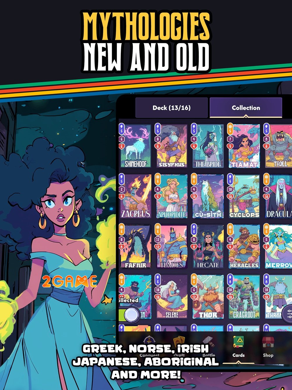 Bạn sẽ thu thập những lá bài lấy cảm hứng từ thần thoại toàn cầu, không chỉ giới hạn ở những câu chuyện quen thuộc như thần Zeus sấm sét từ Hy Lạp cổ đại hay Odin thông thái từ Bắc Âu, mà còn mở rộng đến những truyền thuyết ít được biết đến hơn, chẳng hạn như các linh hồn samurai từ Nhật Bản với nữ thần Amaterasu mang ánh sáng mặt trời, hoặc những sinh vật huyền bí từ thổ dân Úc như Bunyip – con quái vật đầm lầy đầy bí ẩn, thậm chí cả những yếu tố hiện đại như quái vật đô thị trong folklore đương đại.