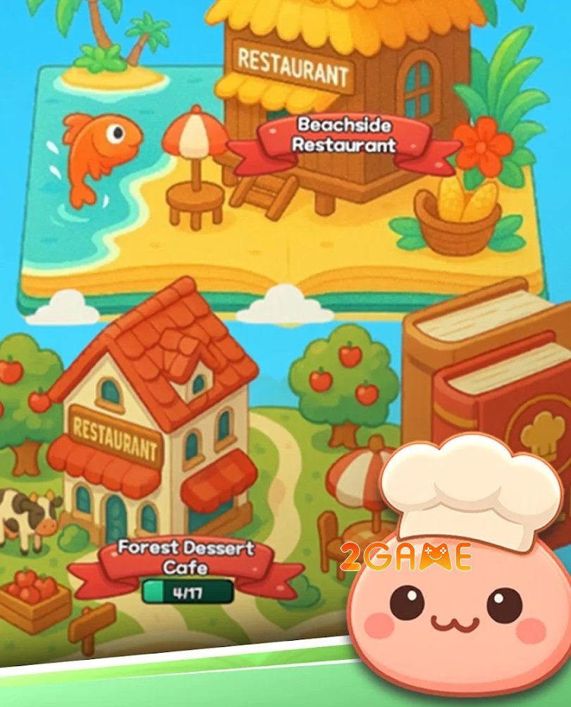 Mỗi khi hoàn thành một stage, bạn lại được mở khóa một nhà hàng hoàn toàn mới với chủ đề riêng, từ quán cà phê rừng xanh dịu dàng, tiệm bánh ngọt ma mị cho đến nhà hàng sushi đậm chất Midgard cổ điển. Cứ thế, bạn vừa chơi vừa sưu tầm công thức, nâng cấp nguyên liệu và trang trí không gian theo phong cách của riêng mình.