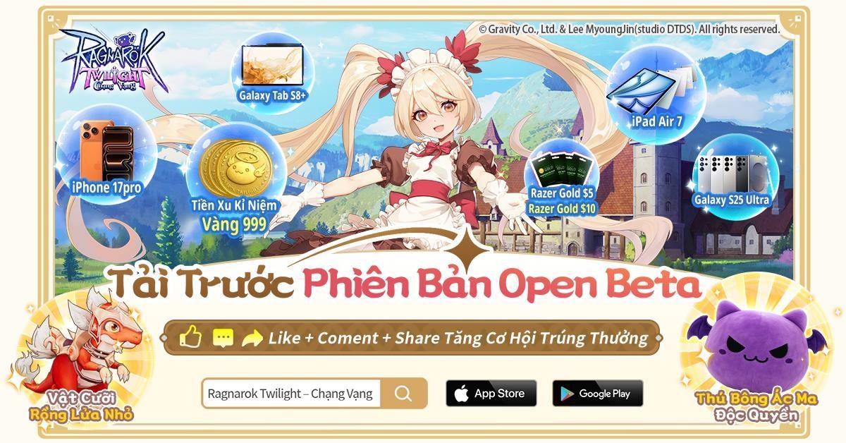 Truy cập Facebook chính thức để tham gia sự kiện xác nhận tải game và cuộc thi sáng tạo nội dung, còn có cơ hội chia nhau tổng giá trị giải thưởng hơn 3 tỷ VNĐ, với các phần quà siêu xịn như iPhone 17 Pro Max, Galaxy S25 Ultra, iPad Air 7, Đồng xu kỷ niệm Vàng 999, cùng quà lưu niệm Ác Ma Poring phiên bản giới hạn và nhiều phần thưởng khác. Thời gian sự kiện cụ thể vui lòng theo dõi trên trang Facebook chính thức!