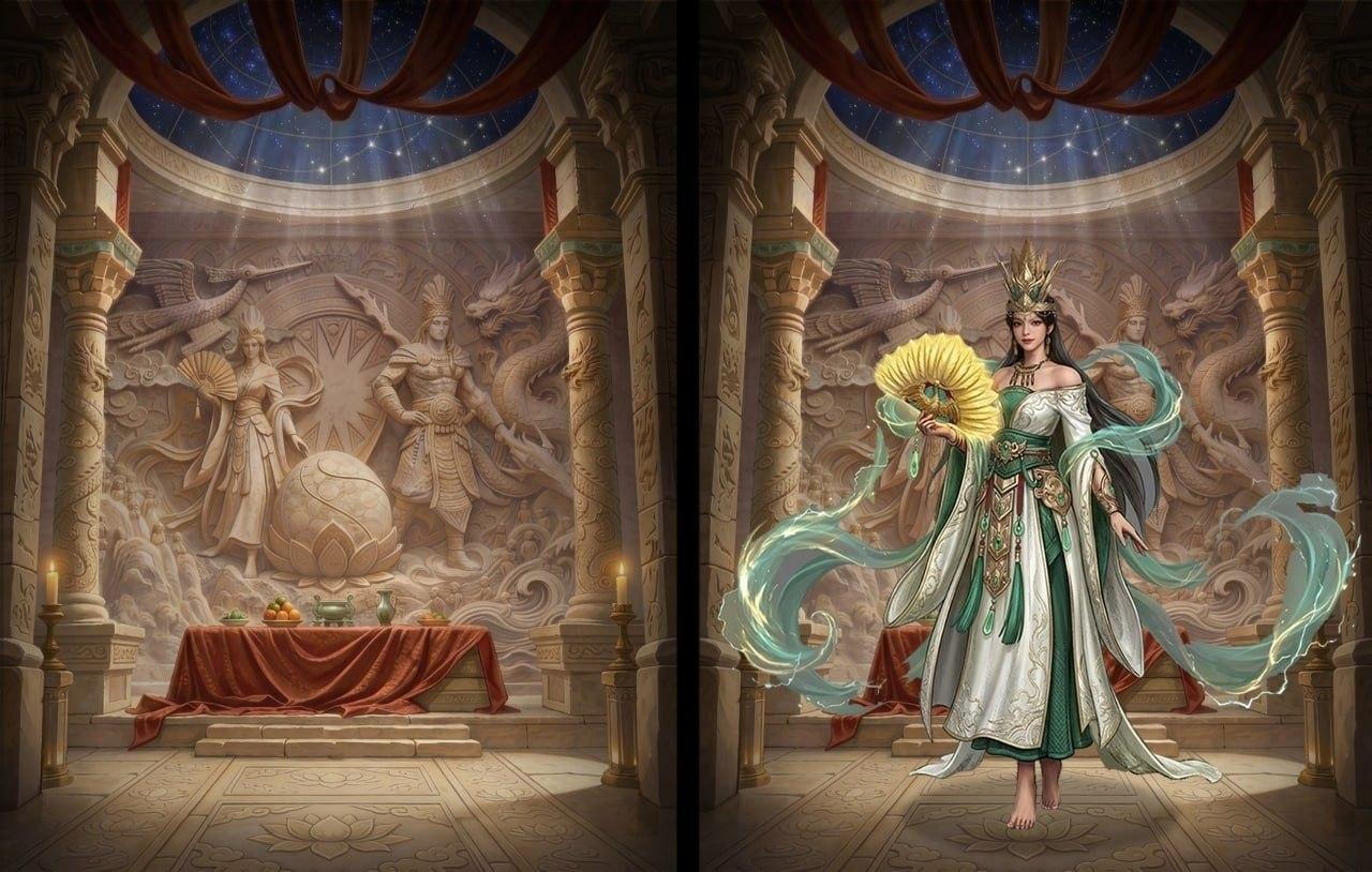Ở chiều ngược lại, Âu Cơ lại được khắc họa theo hướng mềm mại nhưng không kém phần uy nghi. Bộ trang phục trắng xanh ngọc kết hợp cùng các dải lụa bay nhẹ tạo cảm giác linh thiêng, thoát tục. Chiếc quạt lông trên tay cùng vương miện thanh mảnh giúp nhân vật giữ được nét dịu dàng đặc trưng, nhưng vẫn toát lên khí chất của một “quốc mẫu”. Hiệu ứng năng lượng bao quanh cơ thể còn khiến Âu Cơ không chỉ đẹp về hình thức, mà còn mang chiều sâu của một nhân vật huyền thoại.