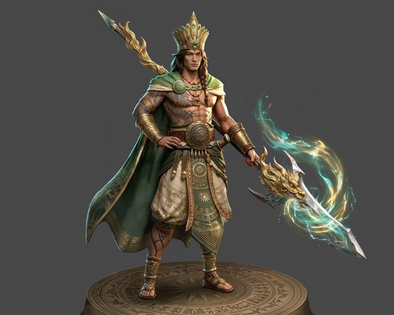 Nếu như Âu Cơ hiện lên với vẻ đẹp thanh cao thì Lạc Long Quân lại mang một sắc thái hoàn toàn khác: Mạnh mẽ, uy nghiêm và đầy khí chất của một vị thủy tổ. Nhân vật được xây dựng với vóc dáng vạm vỡ, cơ thể săn chắc phủ đầy hoa văn mang hơi hướng bộ tộc cổ xưa, kết hợp cùng bộ trang phục tông xanh vàng đậm chất quyền lực. Chiếc vương miện cao, chi tiết chạm khắc tinh xảo cùng cây vũ khí mang hình tượng đầu rồng phát sáng tạo nên một tổng thể vừa hoang dã, vừa thần thánh. Không khó để nhận ra, đây là một hình ảnh đại diện cho sức mạnh và sự kiêu hãnh của “dòng máu Rồng”.