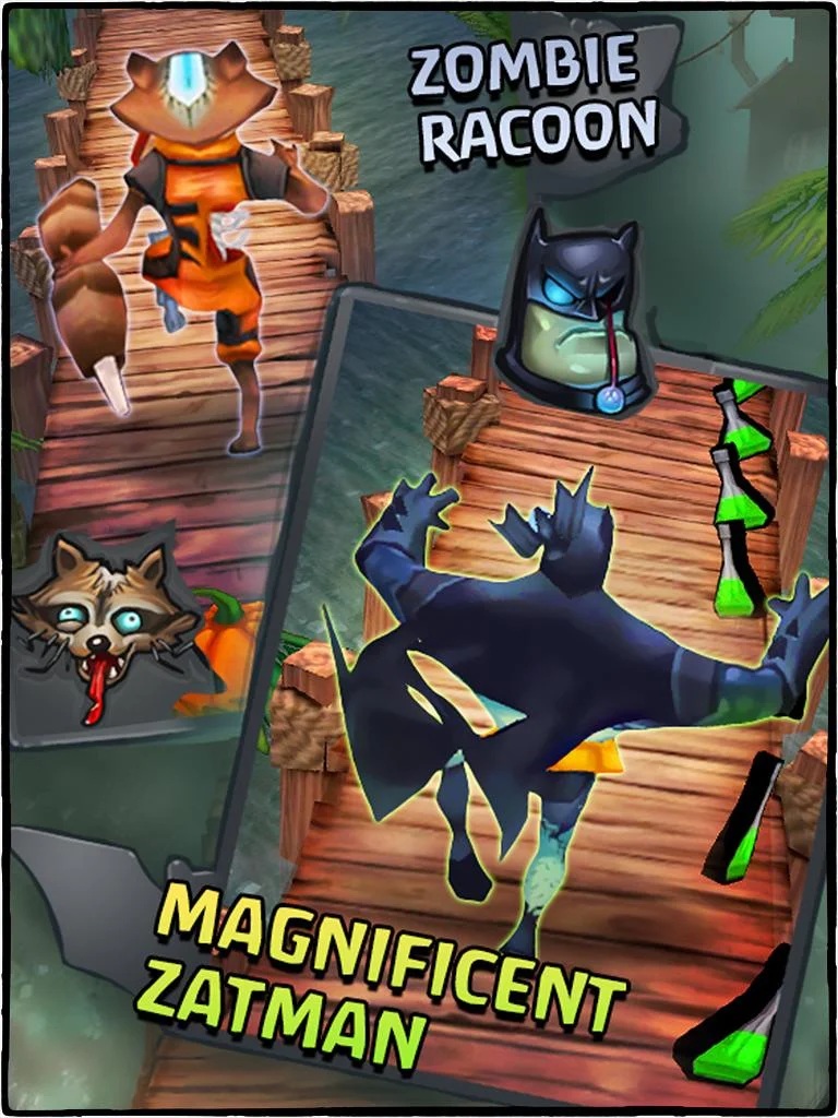 Một điểm nhấn thú vị là hệ thống tùy chỉnh nhân vật đa dạng, cho phép bạn chọn từ hàng loạt zombie parody hài hước. Chẳng hạn, Zuperman – siêu anh hùng zombie bay lượn như sóng thần trong ngày tận thế, hay Zatman – kẻ săn tội phạm bóng đêm với áo choàng đen kịt. Nếu thích phong cách phiêu lưu, bạn có thể chọn Temple Runner, lấy cảm hứng từ Jumanji, chạy qua đền thờ cổ kính. Còn gì vui hơn khi hóa thân thành bà già zombie đuổi theo bánh quy, hay Zcooby Doo – zombie hài hước chuyên bắt ma?